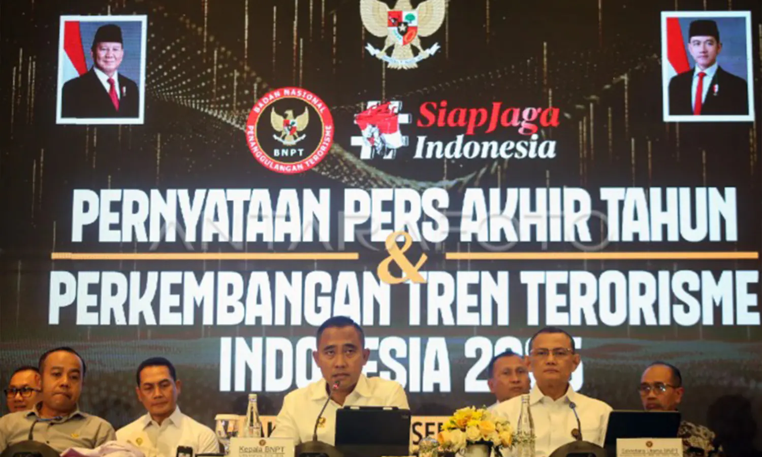 Kepala Badan Nasional Penanggulangan Terorisme (BNPT) Komjen (Purn) Eddy Hartono (tengah) menyampaikan paparannya saat pernyataan pers akhir tahun dan perkembangan tren terorisme Indonesia 2025 di Jakarta, Selasa (30/12/2025). (Foto: Dok. ANTARA)