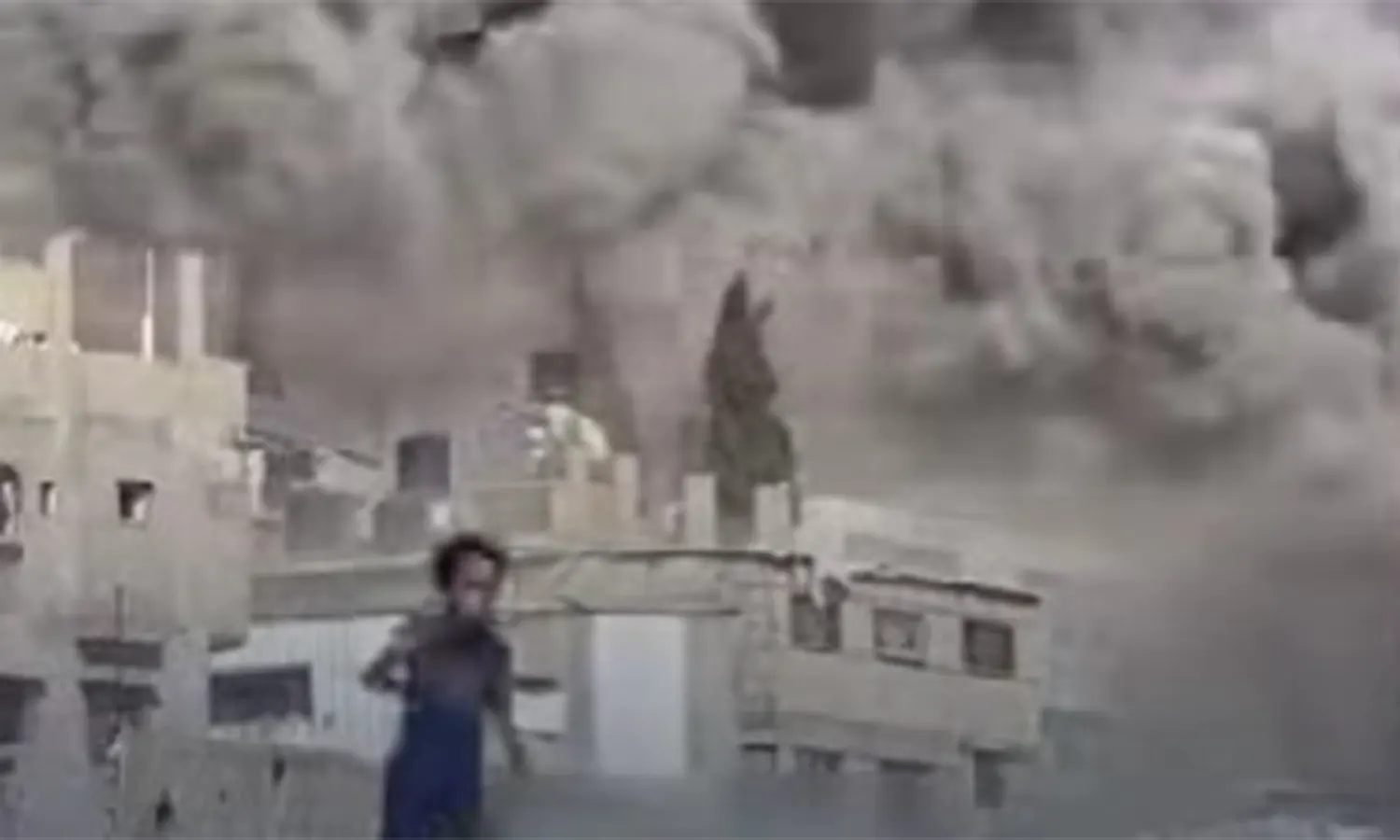 Dalam kekacauan itu, video menangkap adegan memilukan: seorang gadis kecil yang berada di sekitar lokasi mendadak berlari sekuat tenaga, mencoba menjauh dari hujan bom.