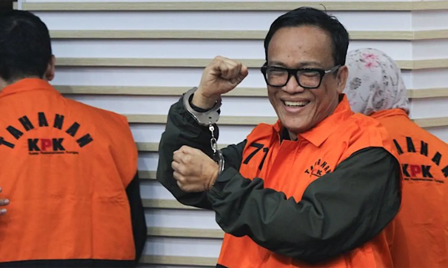 Dalam jumpa pers, Noel terlihat mengenakan rompi tahanan oranye khas KPK dengan tangan diborgol, berdiri bersama para tersangka lainnya.