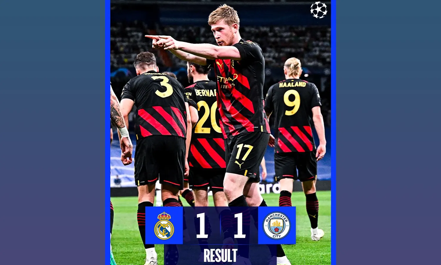 Duel leg pertama semifinal Liga Champions 2022/2023 antara Real Madrid dan Manchester City berakhir dengan skor imbang 1-1 di Stadion Santiago Bernabeu pada Rabu (10/5/2023) dini hari WIB. (Foto: Instagram/@championsleague)