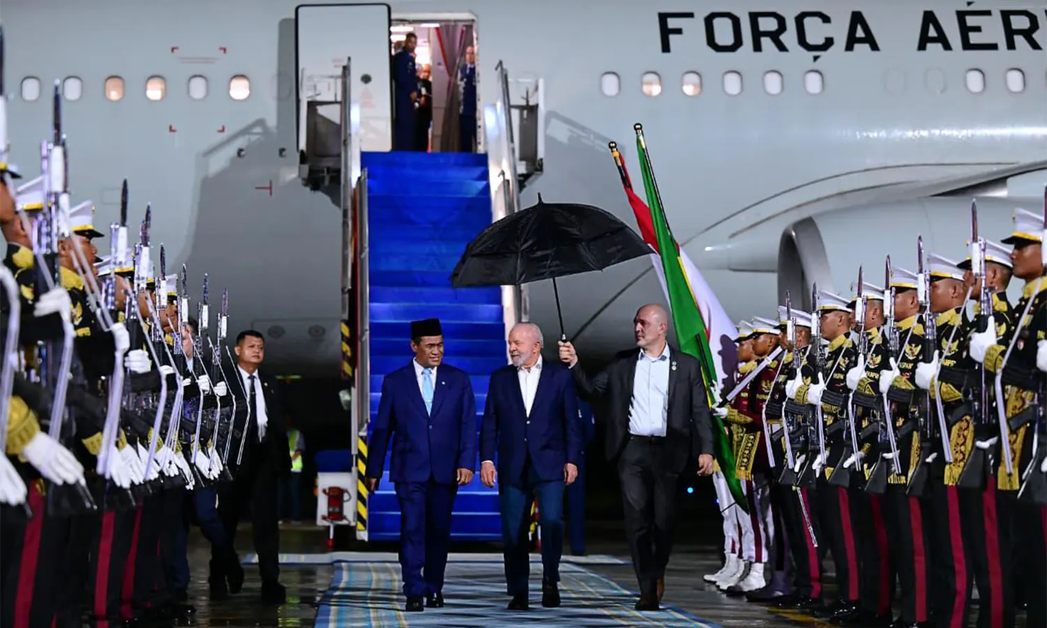 Suasana penyambutan berlangsung khidmat namun hangat. Setelah menyalami para pejabat yang hadir, Presiden Lula berjalan melewati pasukan jajar kehormatan yang berdiri tegak di sepanjang jalur penyambutan.