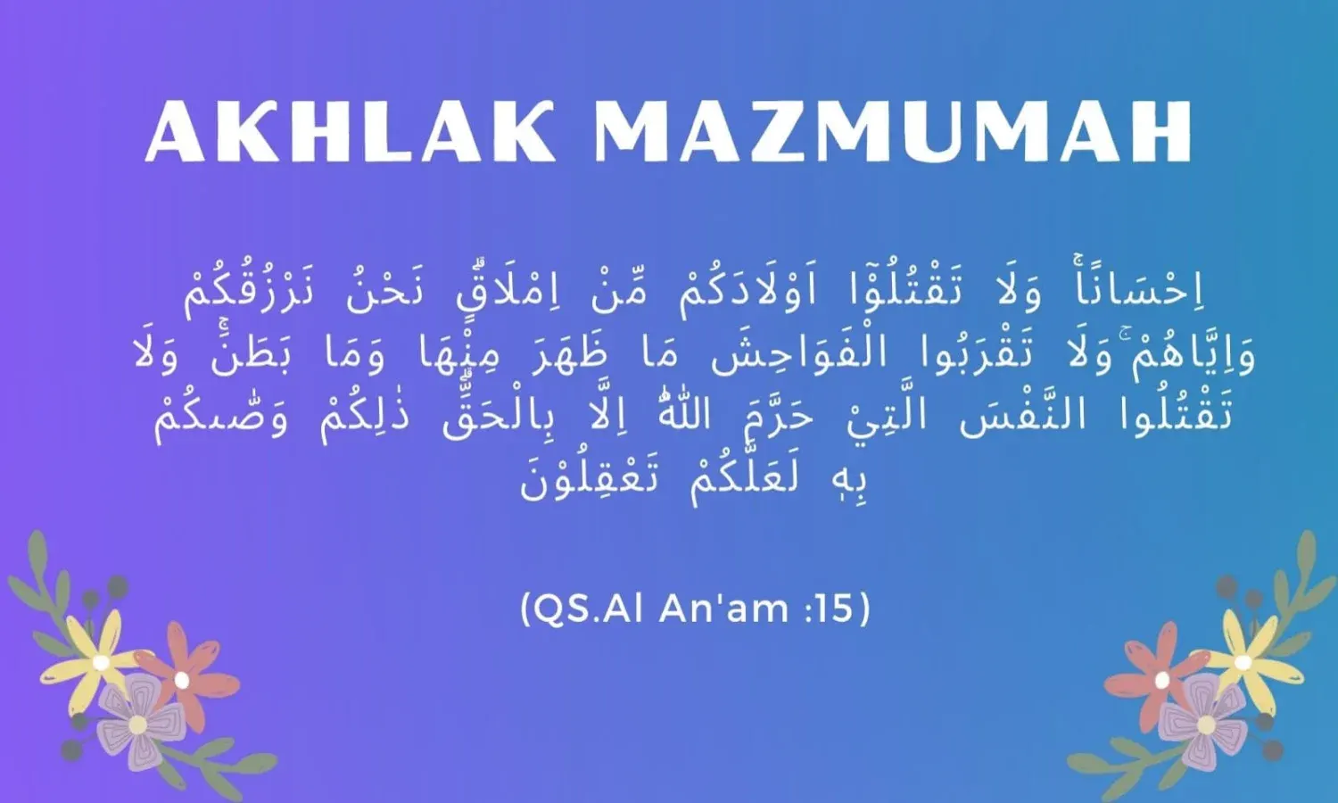Artinya: "Katakanlah (Muhammad), “Marilah aku bacakan apa yang diharamkan Tuhan kepadamu. Jangan mempersekutukan-Nya dengan apa pun, berbuat baik kepada ibu bapak, janganlah membunuh anak-anakmu karena miskin. Kamilah yang memberi rezeki kepadamu dan kepada mereka; janganlah kamu mendekati perbuatan yang keji, baik yang terlihat ataupun yang tersembunyi, janganlah kamu membunuh orang yang diharamkan Allah kecuali dengan alasan yang benar. Demikianlah Dia memerintahkan kepadamu agar kamu mengerti". (Q.S. Al-An’am, ayat 151)
