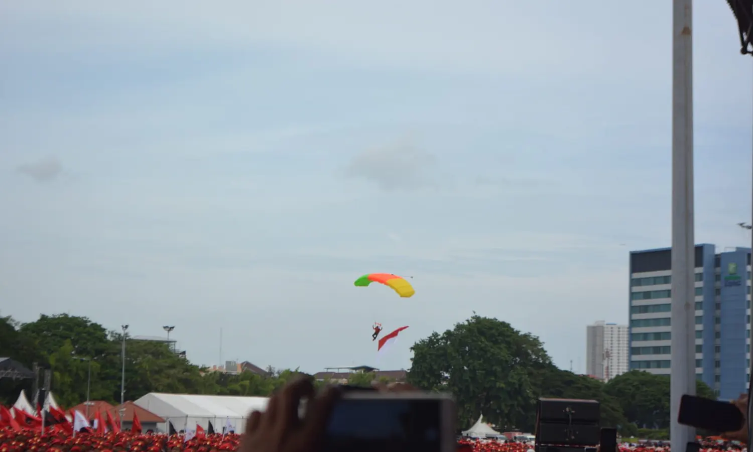 PARBOABOA, Jakarta - Aksi terjun payung mewarnai acara HUT ke-50 Partai Demokrasi Indonesia Perjuangan (PDIP) yang berlangsung di JIEXPO Kemayoran, Jakarta Pusat, Selasa (10/01/2023).