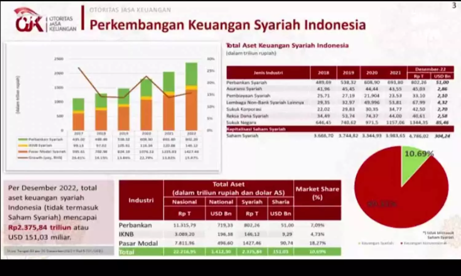 Sedangkan untuk pngsa pasar atau market share keuangan syariah RI hingga akhir Desember 2022 mencapai 10,69 persen dari total nilai aset keuangan Indonesia.