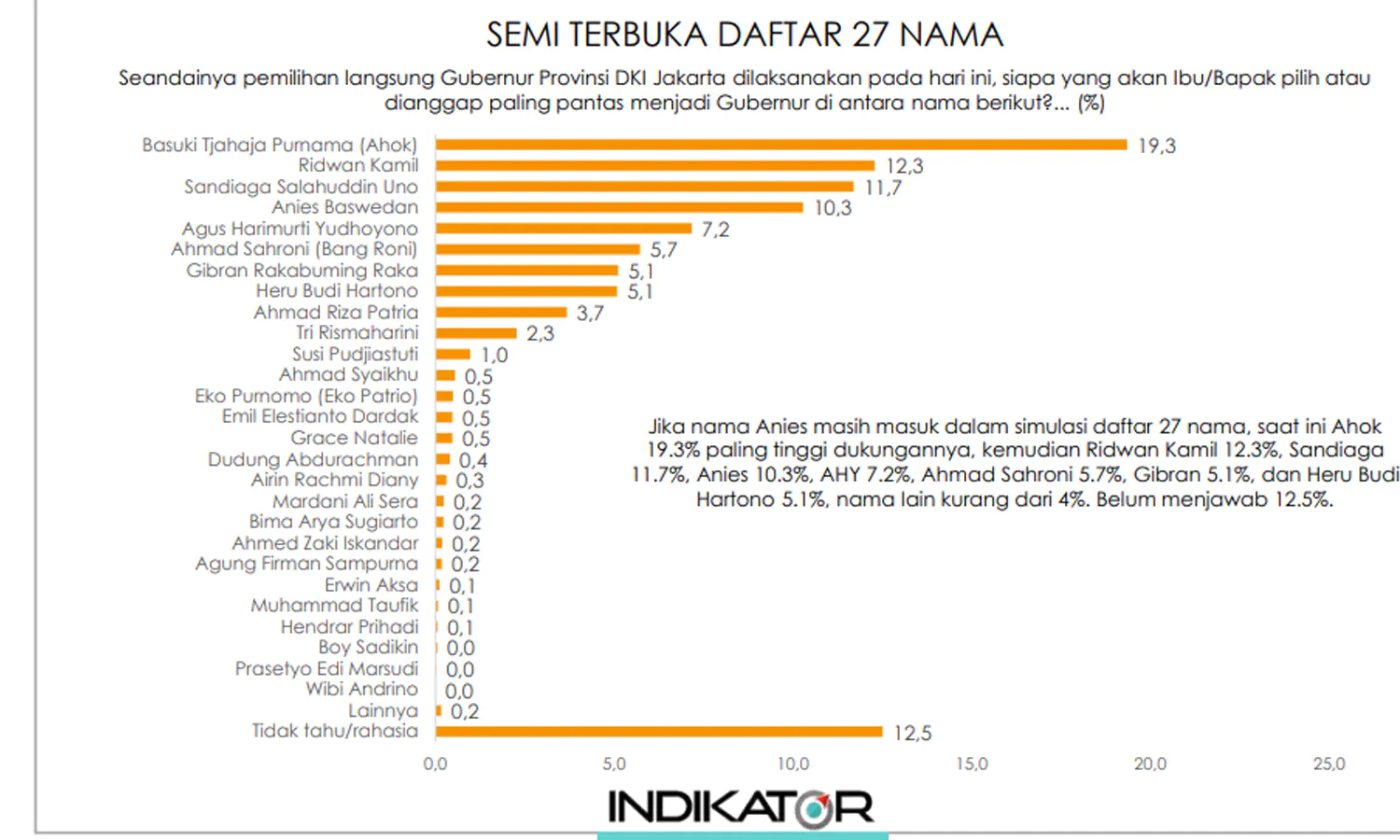 Dalam survei yang sama, apabila nama Anies Baswedan dihapus dalam daftar calon gubernur, Ahok masih bertahan di posisi puncak dengan 20,8 persen suara. Disusl Ridwan Kamil dengan 16,4 persen suara, Sandiaga 14,8 persen suara, lalu AHY mendapat 9 persen suara, Ahmad Sahroni 7,2 persen, Gibran 6 persen, serta Heru Budi Hartono 5 persen.
