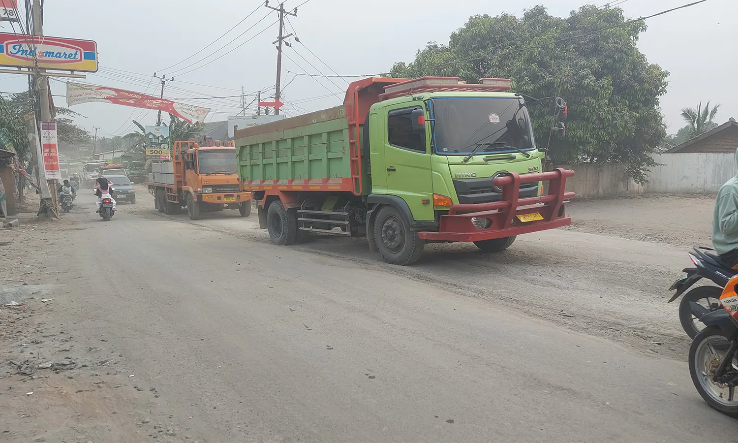 Deru suara mesin jelas terdengar tiap kali truk-truk tersebut lewat. Kendaraan-kendaraan bermuatan penuh itu lalu membubungkan asap knalpot dan debu tebal ke udara.