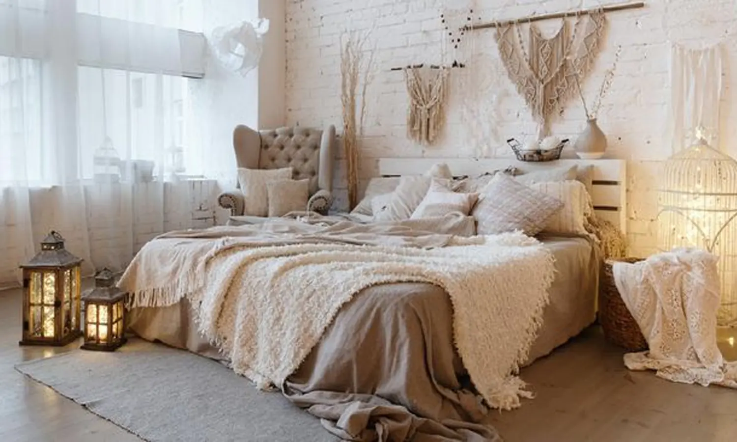 Kamu juga bisa menghadirkan berbagai hiasan kamar kekinian, misalnya saja lampu gantung etnik dan juga pot tanaman anyaman.