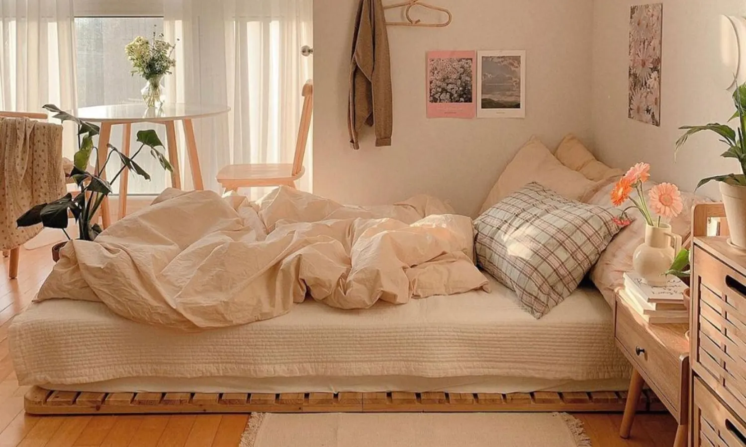 Dekorasi kamar tidur sempit aesthetic tersebut terasa nyaman dan sejuk, karena hadirnya beberapa tanaman hias indoor.