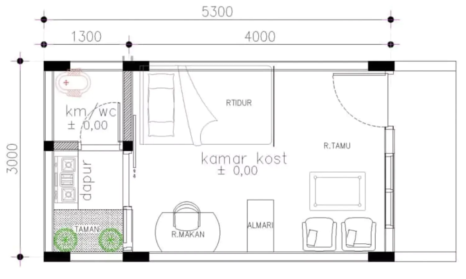 Lalu, dengan denah desain kamar kost 3x4 kamar mandi dalam yang seperti ini juga untuk harga sewanya tidak terlalu mahal, cenderung harganya yang murah serta bersahabat.