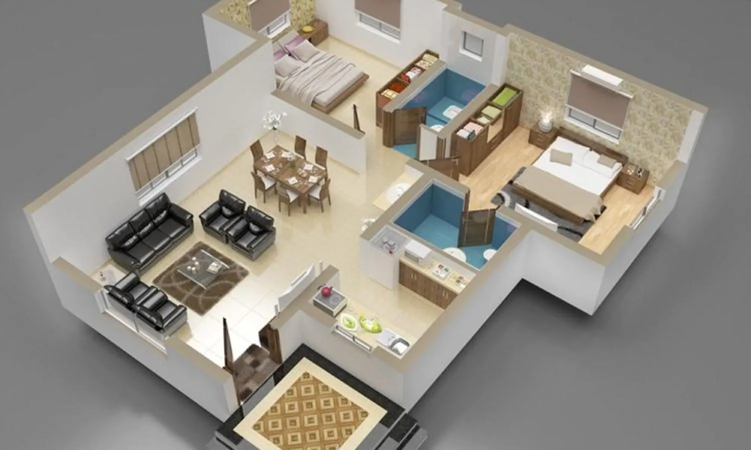 Dilengkapi dengan dua kamar mandi yang terapit oleh kamar tidur dan ruang tamu. Tak lupa, masih tersisa juga ruang teras depan untuk denah rumah type 45 tiga kamar tidur ini.