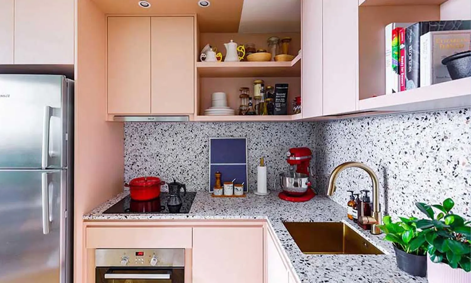 Desain dapur kecil bentuk L berikutnya cocok untuk kamu yang menyukai warna cerah tapi takut kotor.