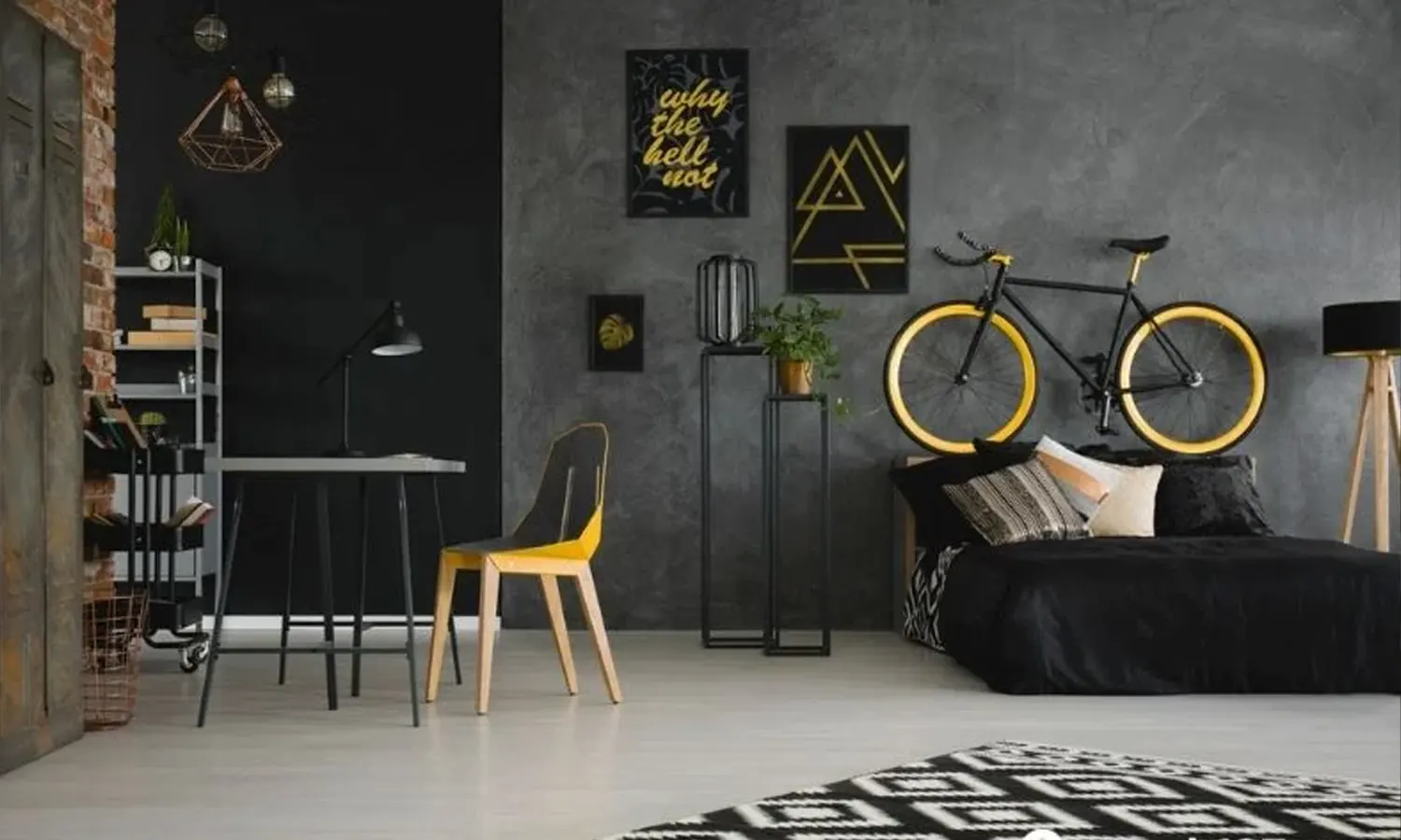 Jika kamu adalah penggemar warna hitam, maka inspirasi desain kamar industrial yang satu ini bisa kamu tiru untuk ruang tidurmu.