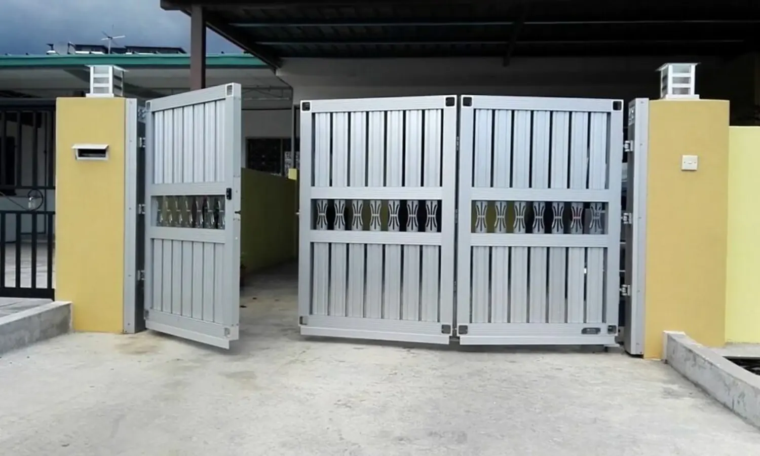 Untuk pagarnya, biasanya terdiri dari dua sisi, yaitu sisi geser dan dorong. Sisi kecil dibuka dengan didorong untuk pejalan kaki atau akses sepeda motor. Sementara sisi besar dapat digeser untuk akses kendaran besar.