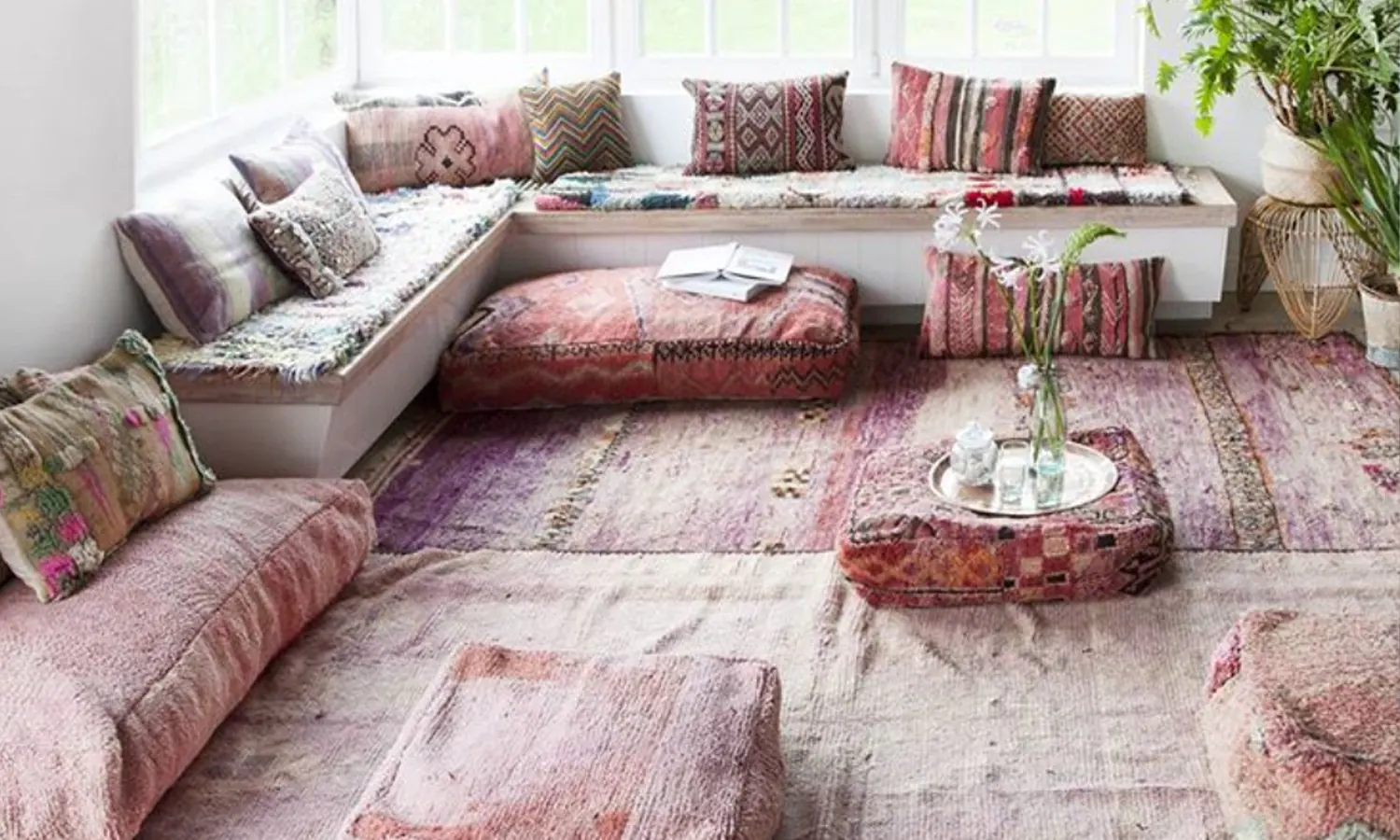 Coba tempatkan beberapa bantal di sekitar karpet atau permadani bermotif bagus.