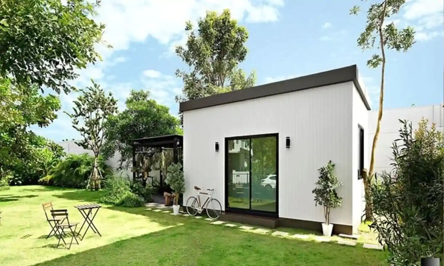 Desain rumah paviliun minimalis nampak elegan di samping rumah kamu sampai tak ada yang mengira kalau itu hanyalah garasi mobil.