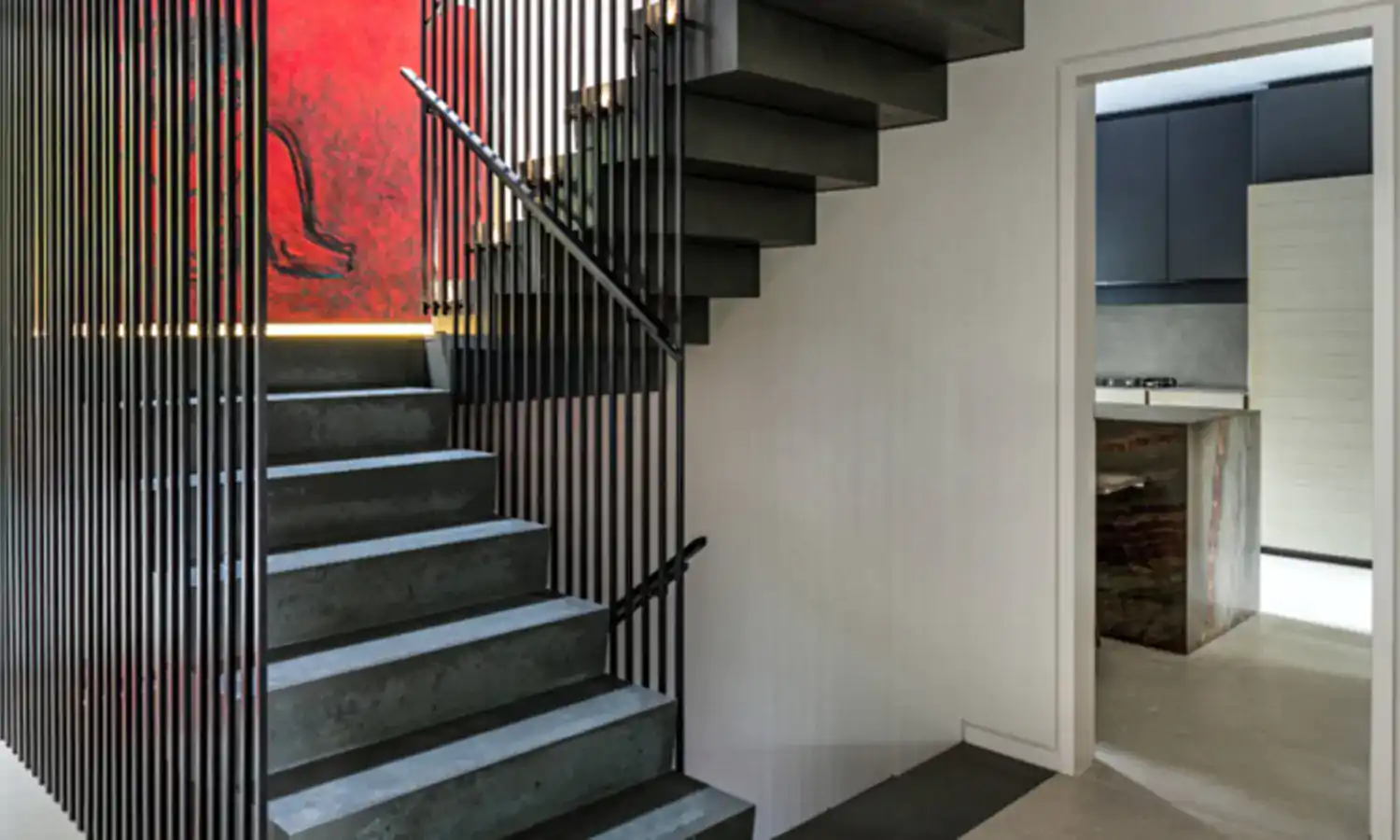 Tangga beton dengan konsep modern adalah salah satu pilihan yang dapat dipilih. Dengan material beton yang kuat, paduan railing garis bermaterial besi membuat tampilan tangga menjadi aesthetic.