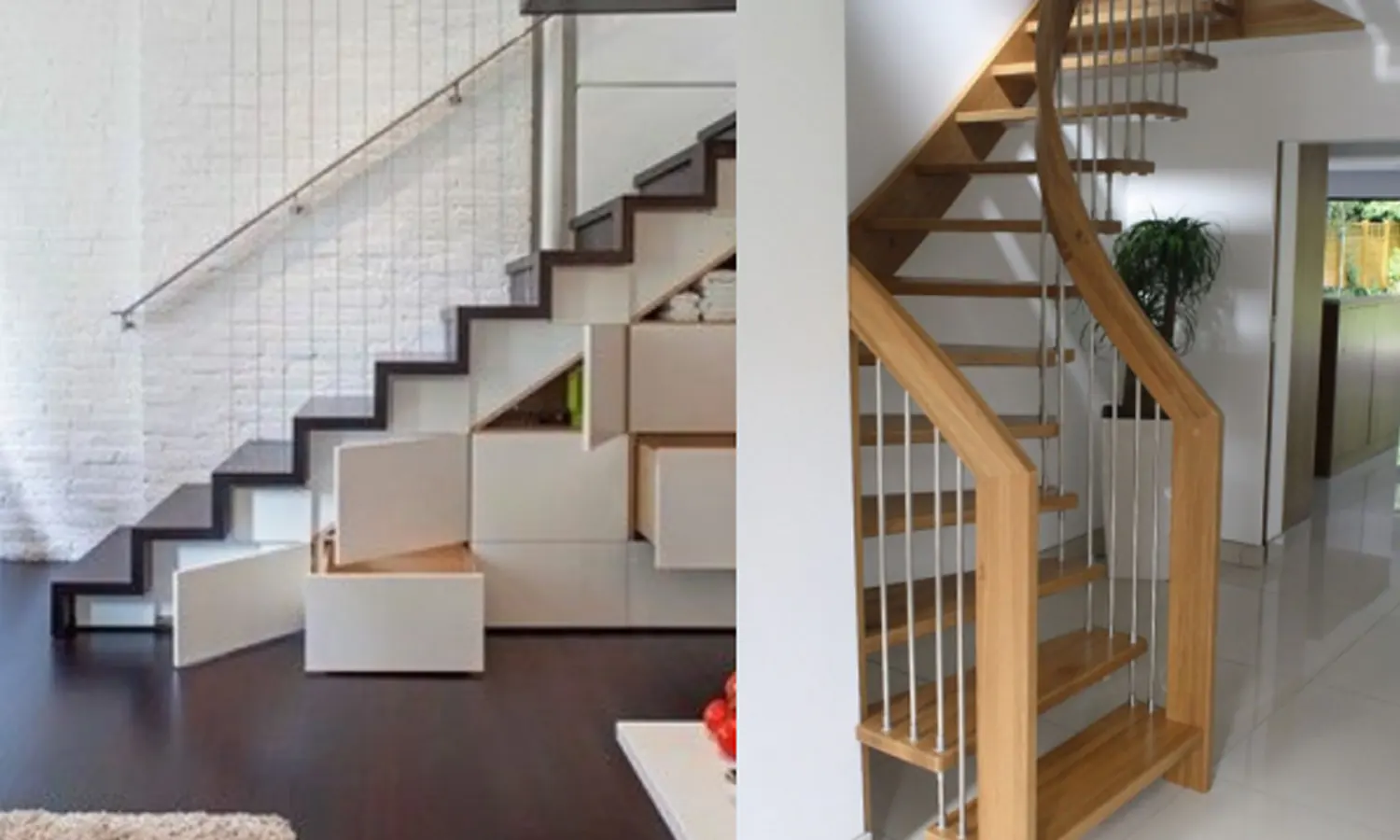 Untuk ruang sempit kamu bisa mengakalinya dengan desain tangga yang melengkung dan anak tangga berjarak. Desain tangga rumah sempit sederhana jenis ini akan terlihat berbeda dan memberikan ruang yang luas dengan sudut sedikit melengkung.