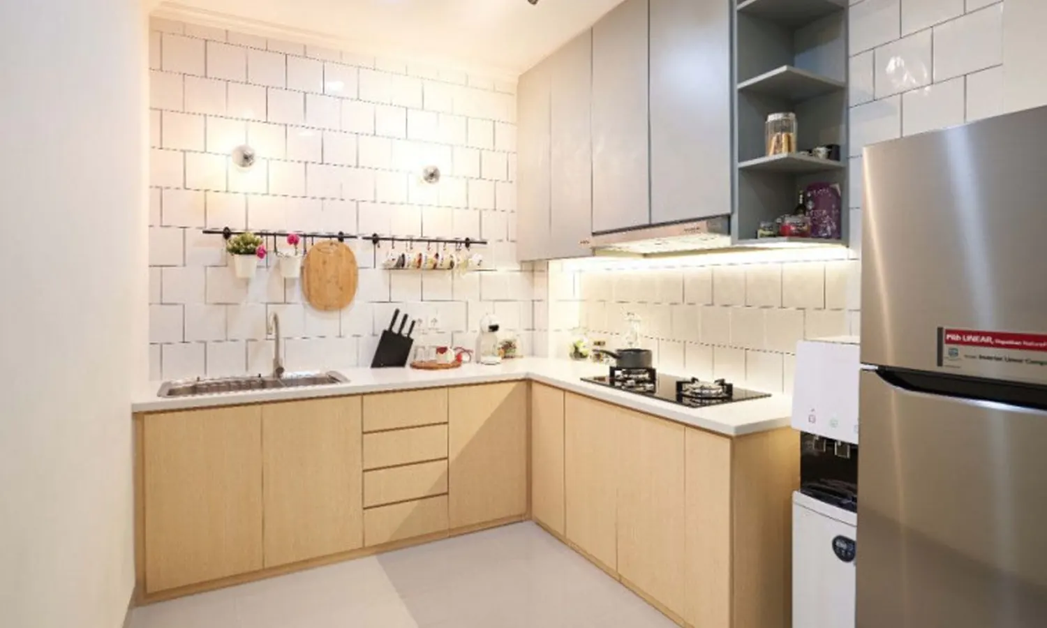 Desain perabot itu cocok diterapkan pada dapur sempit sekali, sehingga dapat memaksimalkan pengunaan ruang.