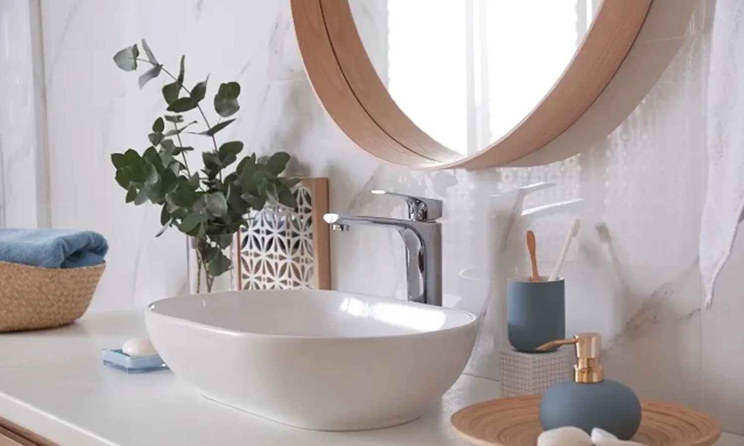 Untuk mempercantik tampilan wastafel, kamu bisa tambahkan cermin bulat dan berbagai botol sabun dengan warna yang serasi.