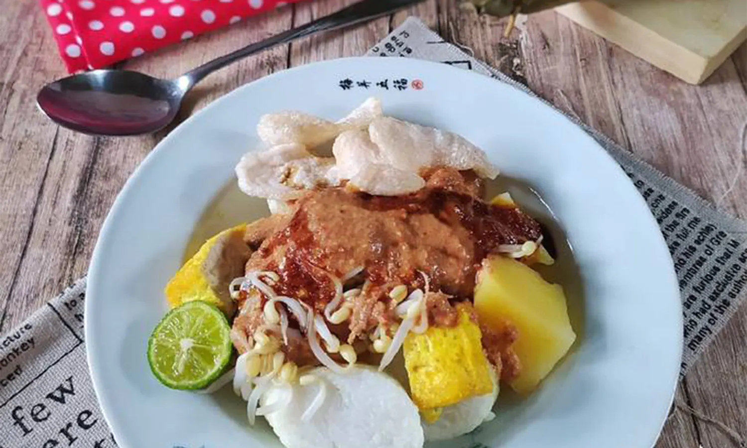 - Potong-potong kentang dan ketupat. Masukkan ke dalam piring saji. Tambahkan tahu, tauge, dan telur. Siram dengan bumbu kacang dan sajikan dengan kerupuk dan bawang goreng.