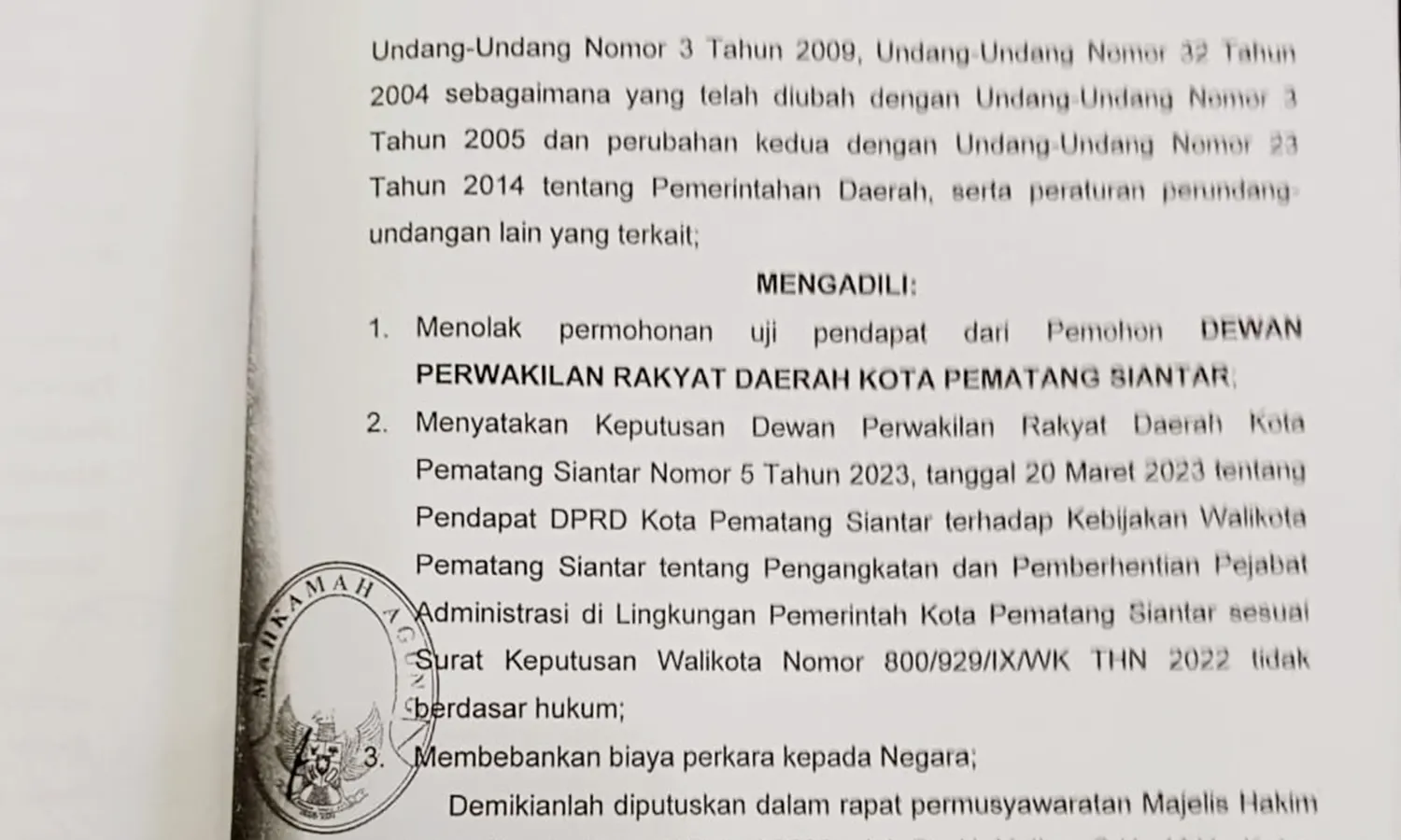 "Putusan MA Nomor 1P/UP/2023 telah diterima dan dari MA telah menolak permohonan uji pendapat dari Pemohon DPRD Kota Pematang Siantar Nomor 5 Tahun 2023, tanggal 20 Maret 2023 tentang Pendapat DPRD Kota Pematang Siantar terhadap Kebijakan Walikota Pematang Siantar tentang Pengangkatan dan Pemberhentian Pejabat Administrasi di Lingkungan Pemerintah Kota Pematang Siantar sesuai Surat Keputusan Walikota Nomor 800/929/IX/WK THN 2022 tidak ramah berdasarkan hukum," ujarnya.