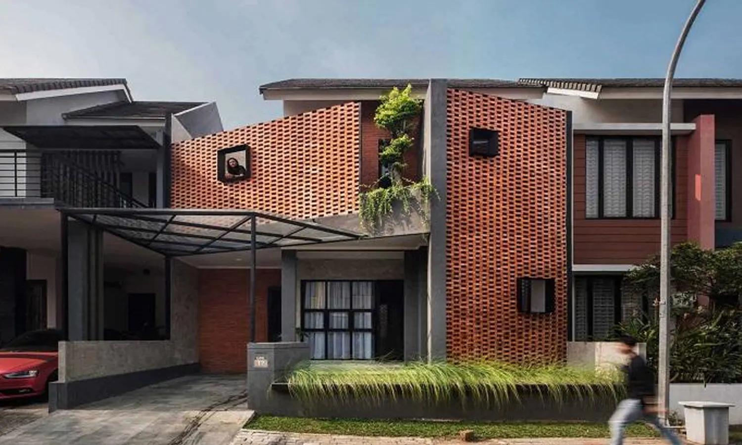 Tampak depan rumah bergaya industrial ini menggunakan dinding bata merah, yang berpadu dengan atap dan pintu masuk berwarna abu-abu.