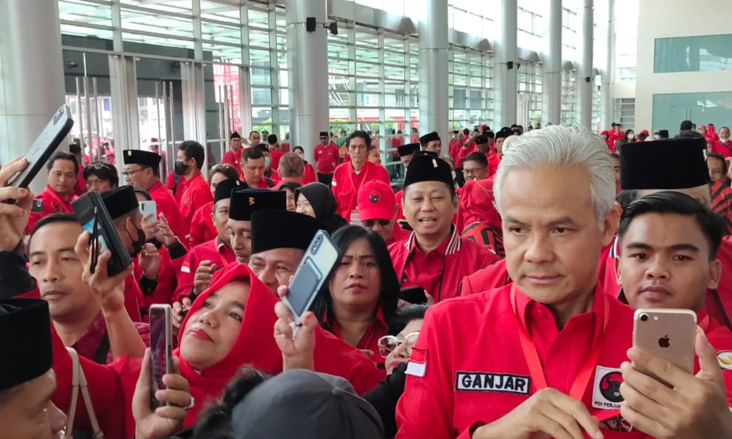 PARBOABOA, Jakarta - Gubernur Jawa Tengah, Ganjar Pranowo hadiri acara Hari Ulang Tahun (HUT) Partai Demokrasi Indonesia Perjuangan (PDIP) ke-50 di Jiexpo Kemayoran, Jakarta Pusat, Selasa (10/01/2022). Kehadiran Ganjar disambut hangat kader partai dan pendukungnya.