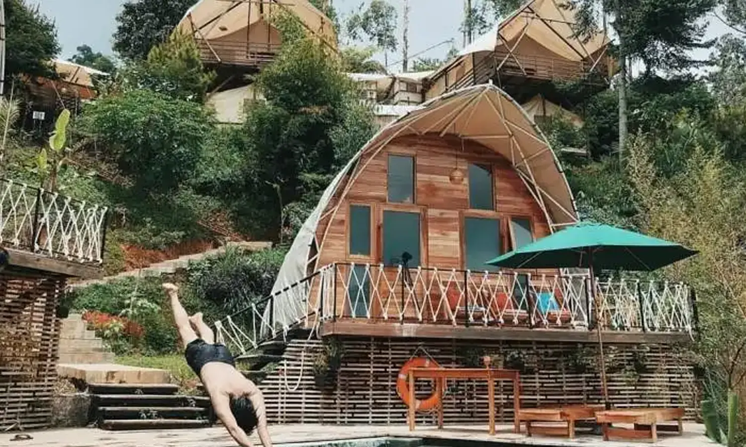 Satu lagi glamping Ciwidey yang menarik dikunjungi, yakni Eco Park Curug Tilu Ciwidey. Tempat glamping di sini berbentuk segitiga, sehingga fasadnya tampak estetik.