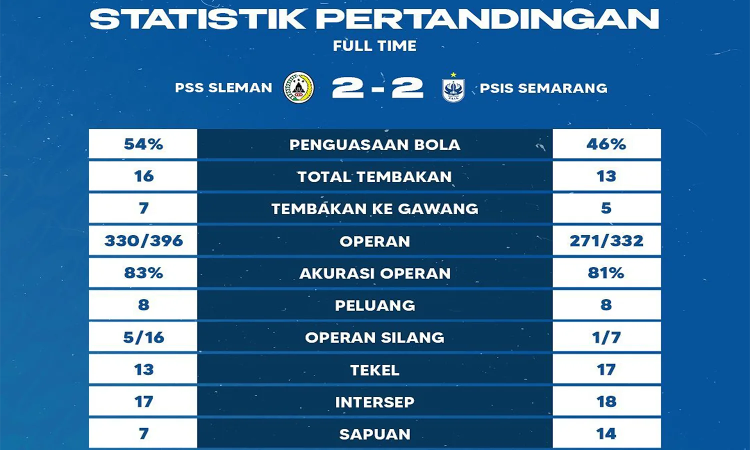 Tak ada gol tambahan yang tercipta pada sisa babak kedua, dan pertandingan berakhir dengan skor 2-2. Hasil ini membuat PSS Sleman berada di posisi delapan klasemen dengan lima poin, sedangkan PSIS Semarang naik ke posisi dua dengan tujuh poin.