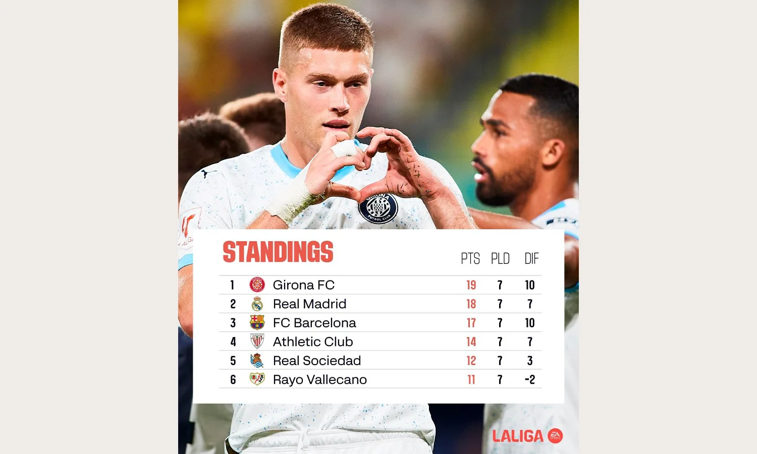 Namun, Real Madrid tidak langsung menempati posisi teratas, karena Girona, yang awalnya berada di posisi kedua, juga berhasil menggeser Barcelona dan berhak berada di puncak klasemen Liga Spanyol.