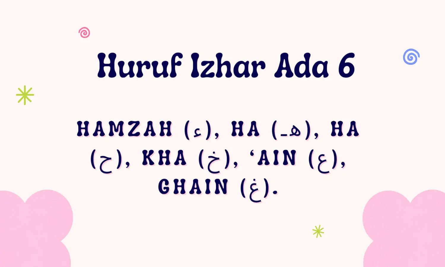 Adapun huruf izhar terdiri dari hamzah (Ø¡), ha (هـ), ha (Ø), kha (Ø®), ‘ain (ع), ghain (غ). Keenam huruf tersebut memiliki makhraj di bagian tenggorokan sehingga sering kali disebut dengan izhar halqi.