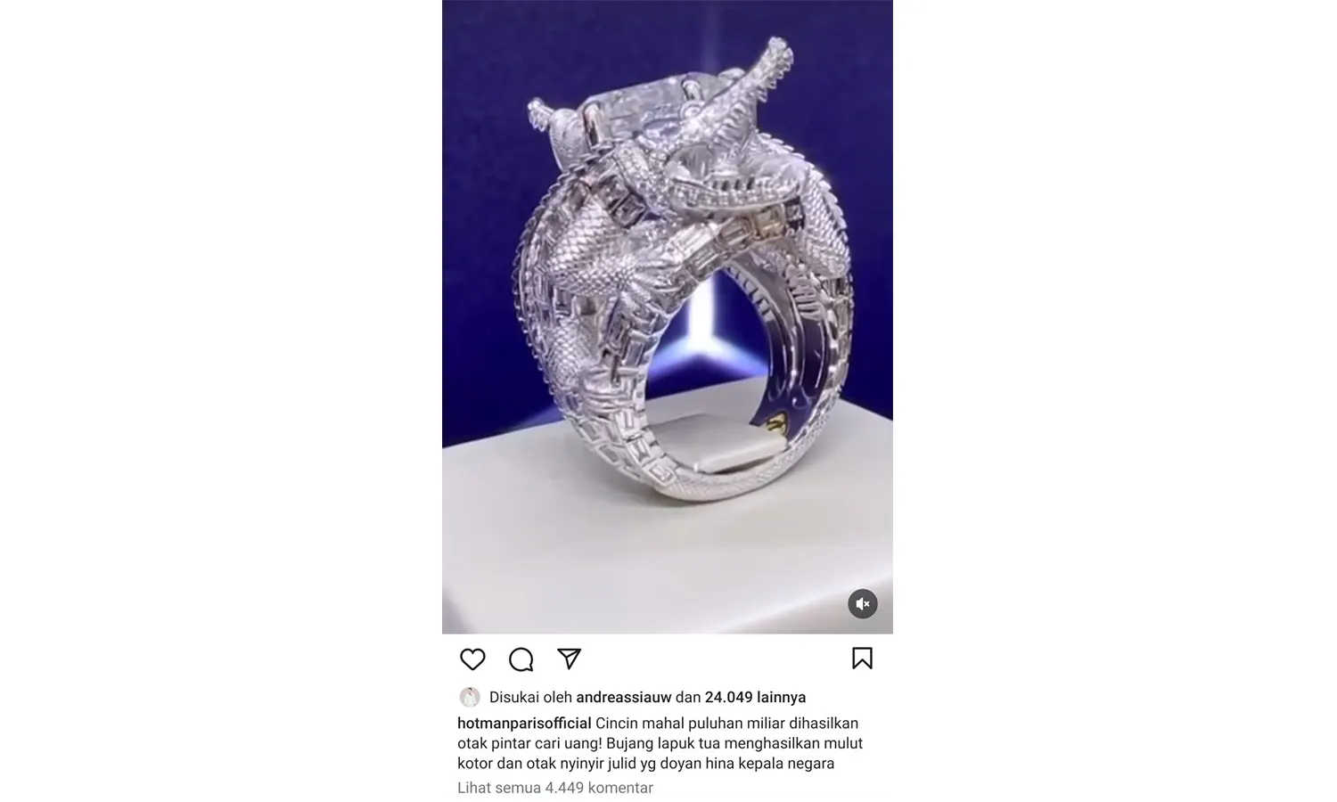 Menurut pantauan PARBOABOA, Kamis (18/04/2024), salah satu unggahan yang menjadi sorotan adalah video yang memperlihatkan sebuah cincin berlian yang diklaim bernilai puluhan miliar rupiah.