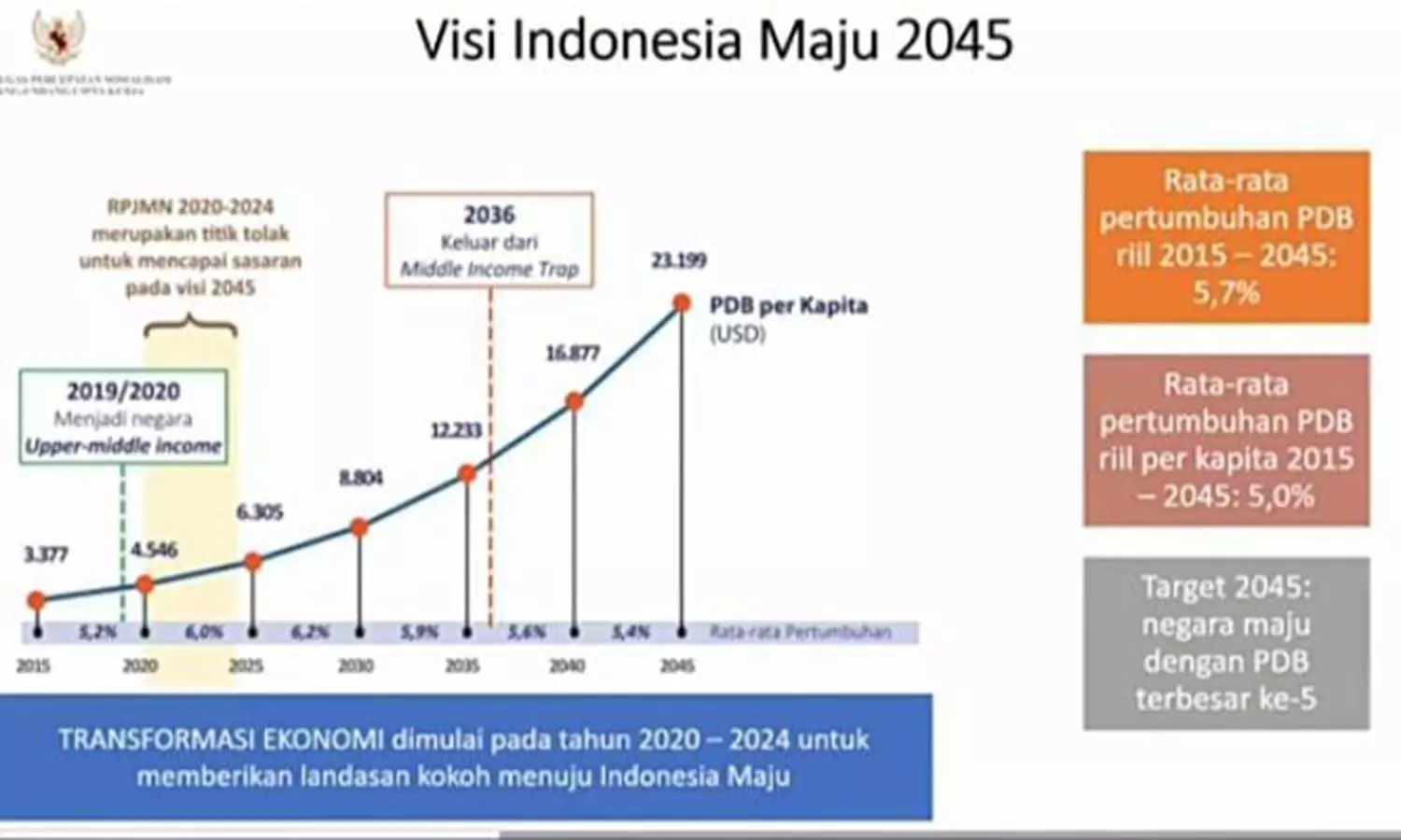 PARBOABOA, Jakarta- Pemerintahan menargetkan Indonesia menjadi negara maju pada 2045, dengan Produk Domestik Bruto (PDB) per kapita sebesar USD23,2 ribu atau Rp324,9 juta. Serta PDB nasional mencapai USD7,4 triliun.