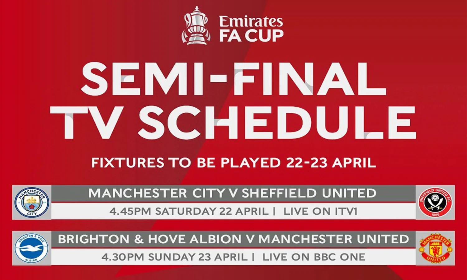 Hasil undian semifinal Piala FA musim ini mempertemukan Man City vs Sheffield United, sedangkan Man Utd akan menghadapi Brighton & Hove Albion.