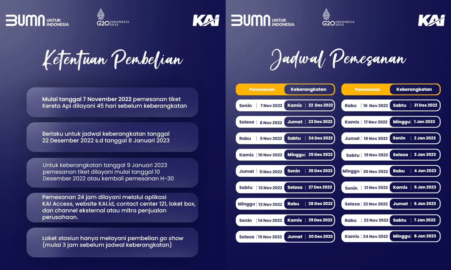Dilansir dari laman Twitter resmi PT. KAI, mulai hari ini Senin (07/11/2022) pemesanan tiket sudah dapat dilakukan melalui beberapa platform seperti KAI Access, website kai.id, Contact Center 121, Loket Box, atau platform resmi milik KAI lainnya, dengan periode keberangkatan tanggal 22 Desember 2022 sampai 08 Januari 2023.