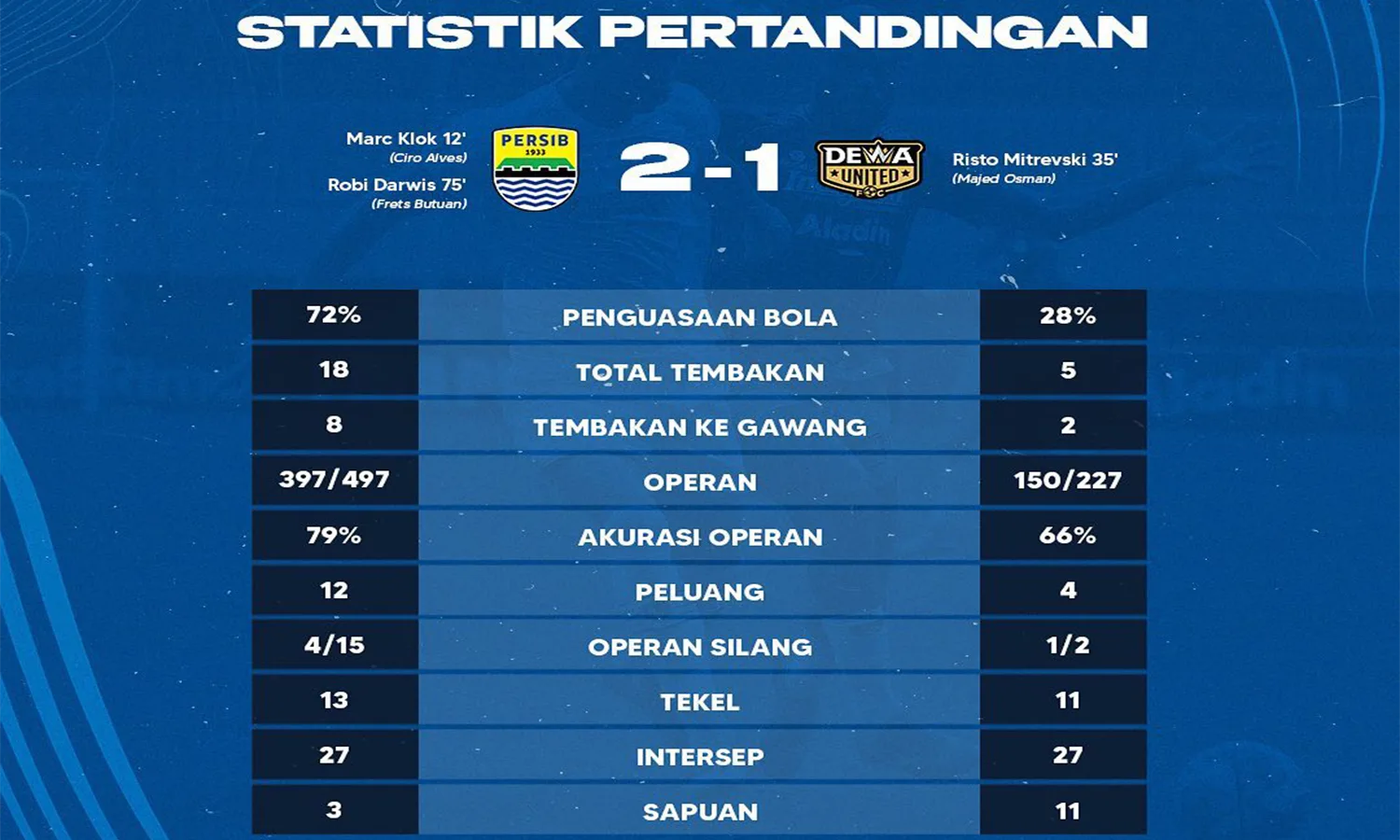 Di babak kedua, Persib Bandung semakin gencar melancarkan serangan dan berhasil mencetak gol kedua pada menit ke-75 melalui sepakan Robi Darwis yang melewati tiga pemain belakang Dewa United.