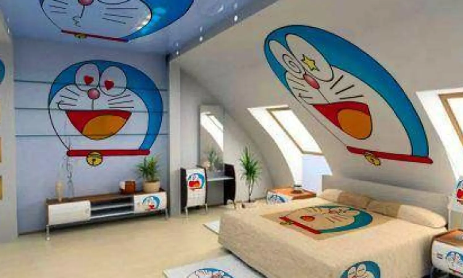 Desain kamar Doraemon sederhana berikutnya menitikberatkan pada penggunaan wallpaper dinding bergambar sosok kucing biru tersebit di bagian dinding dan langit-langit kamar.