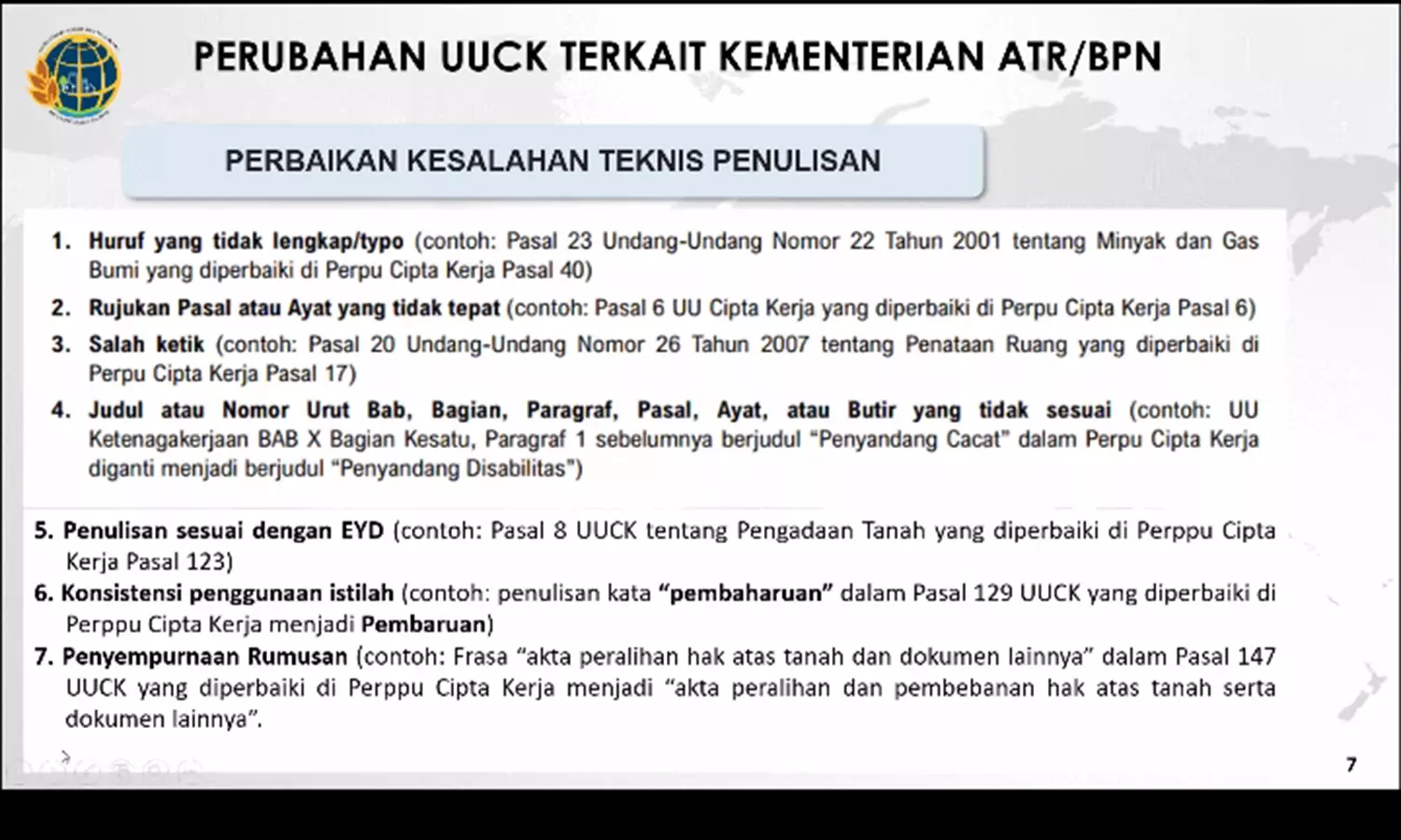 Selanjutnya penulisan dengan EYD, konsistensi penggunaan istilah misalnya kata "Pembaharuan" menjadi "Pembaruan" dan penyempurnaan perumusan. Contohnya akta hak peralihan hak atas tanah dan dokumen lainnya menjadi akta peralihan dan pembebanan hak atas tanah serta dokumen lainnya.