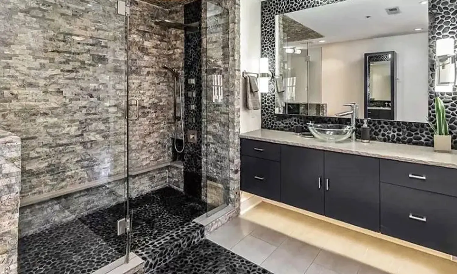 Pada kamar mandi yang areanya cukup lapang, bebatuan alam disusun menjadi dinding pembatas antara area wastafel dengan area shower. Susunan bebatuan ini dibiarkan terlihat tidak rata sehingga memberikan visual tiga dimensi yang artistik.