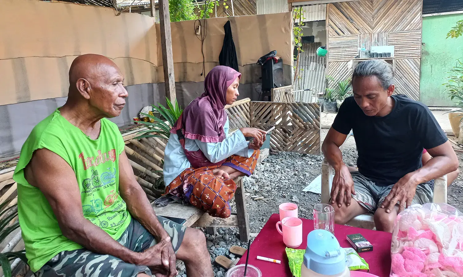 PARBOABOA, Jakarta – Muhammad Furqon bersama warga eks Kampung Bayam lain sedang bersantai sambil berbincang, saat PARBOABOA bertandang ke hunian sementara (huntara) warga eks Kampung Bayam di Jalan Tongkol, Ancol, Pademangan, Jakarta Utara, Selasa lalu.