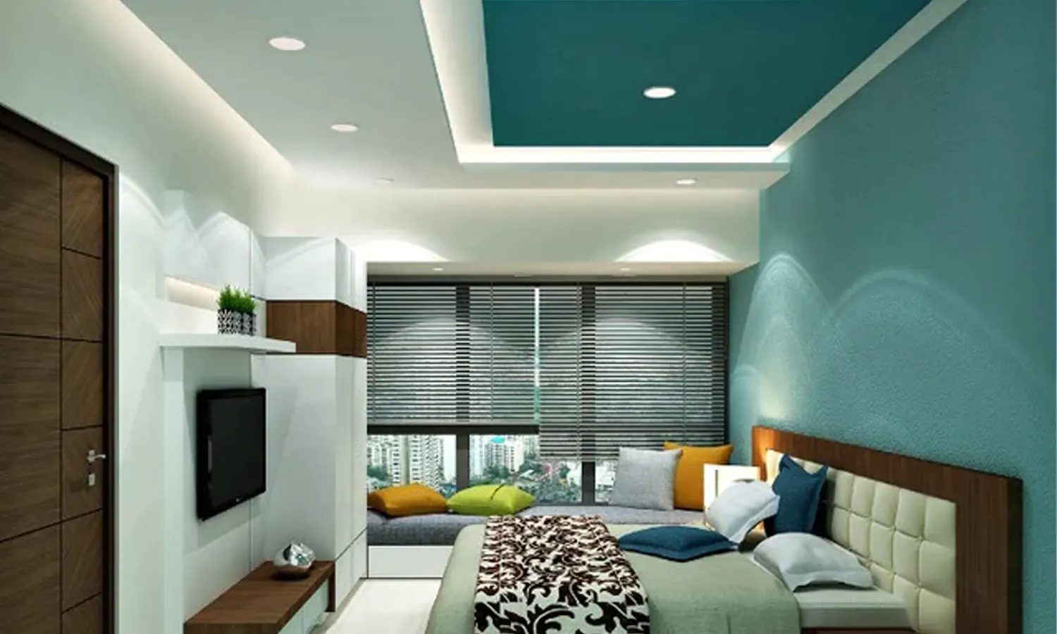 Kombinasi warna cat plafon gypsum putih dan biru gelap menciptakan ilusi langit-langit yang lebih rendah, meskipun ukuran plafon tampak tinggi.