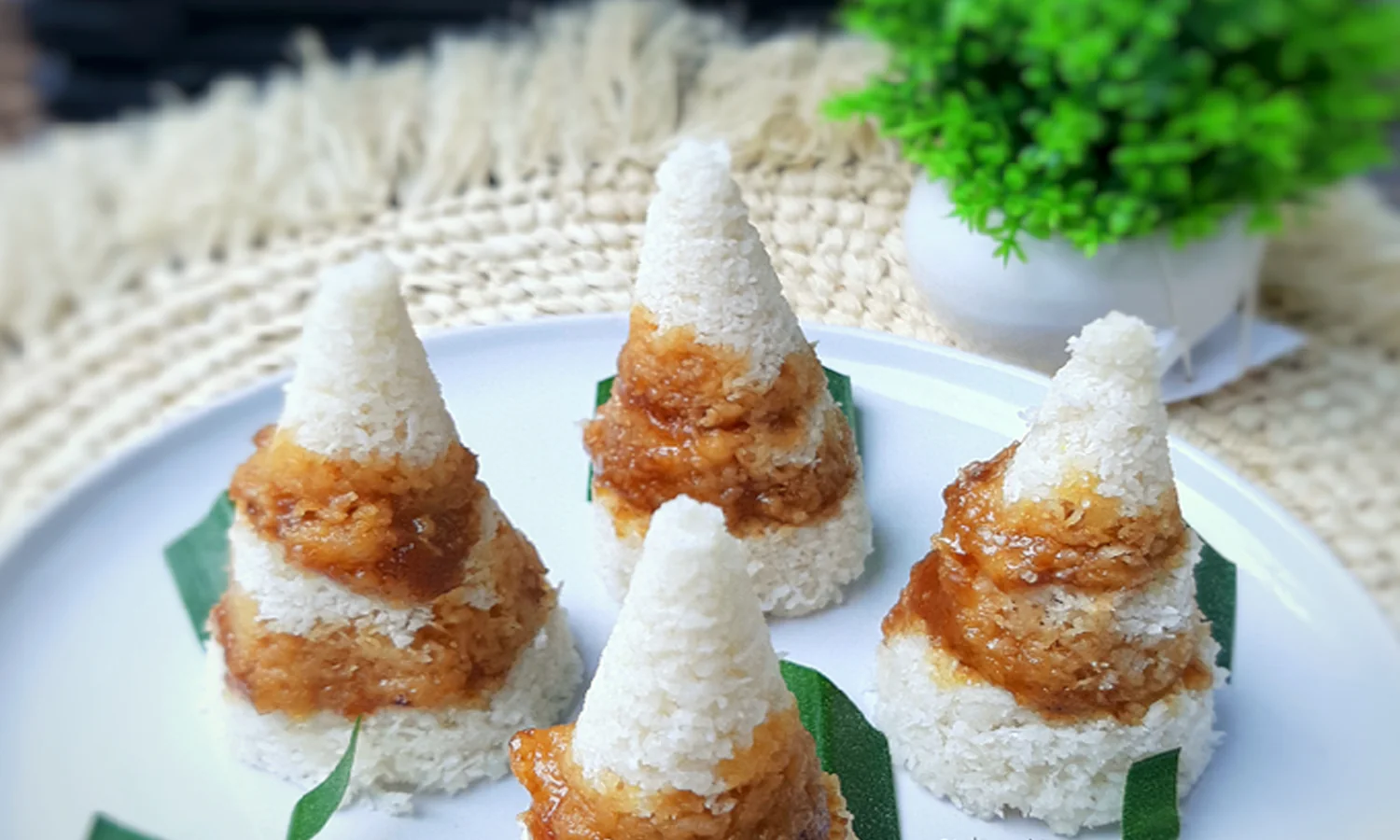 Setelah itu, tepung diisi dengan gula aren, kemudian ditempatkan dalam wadah berbentuk tumpeng dan dikukus. Sebagai Pelengkap, di atasnya diberi taburan kelapa yang sudah diparut. Kue ini paling enak dinikmati ketika masih dalam keadaan hangat.
