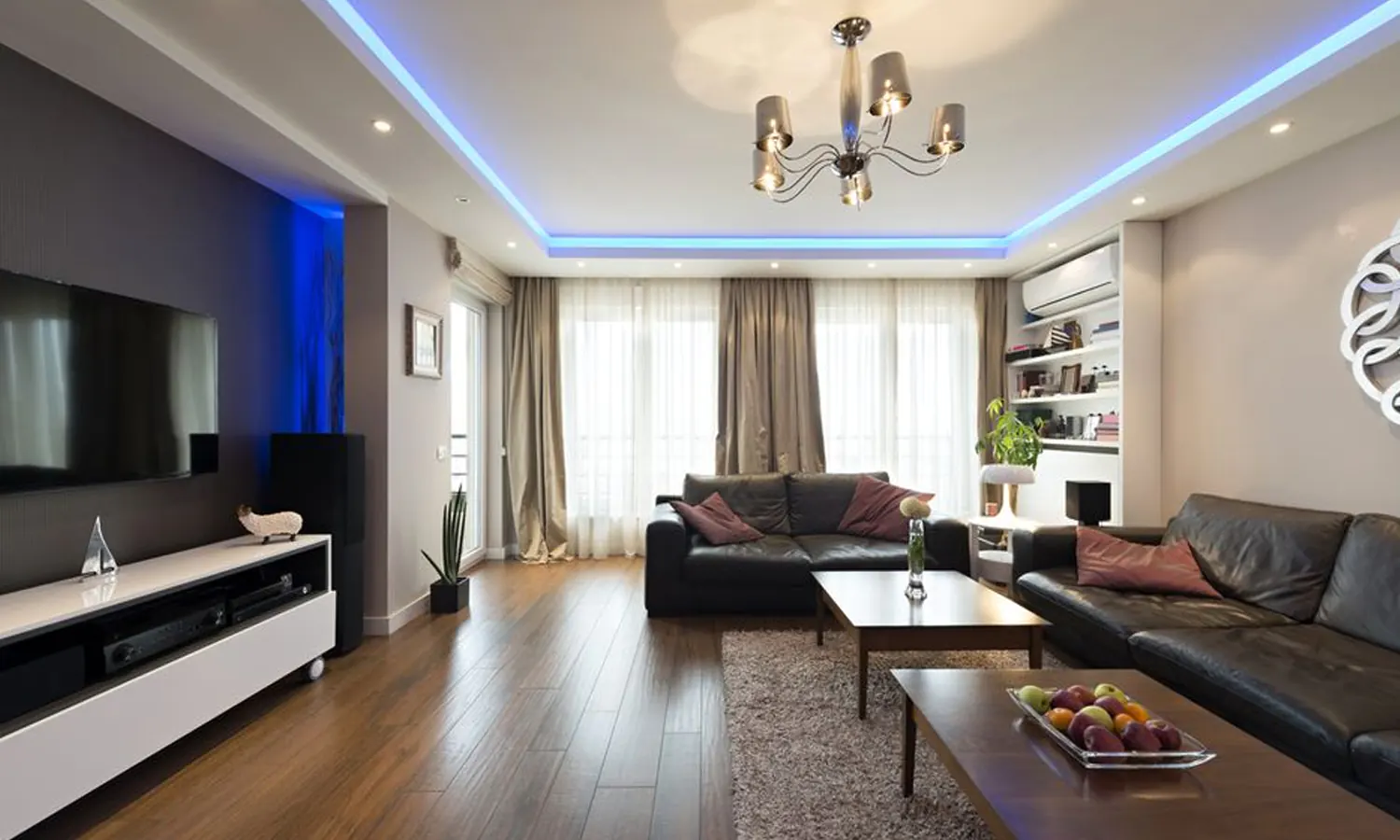 Lampu LED-nya disembunyikan di balik plafon secara memanjang. Saat menonton TV, nyalakan lampu LED plafon tersebut dan matikan lampu utama.