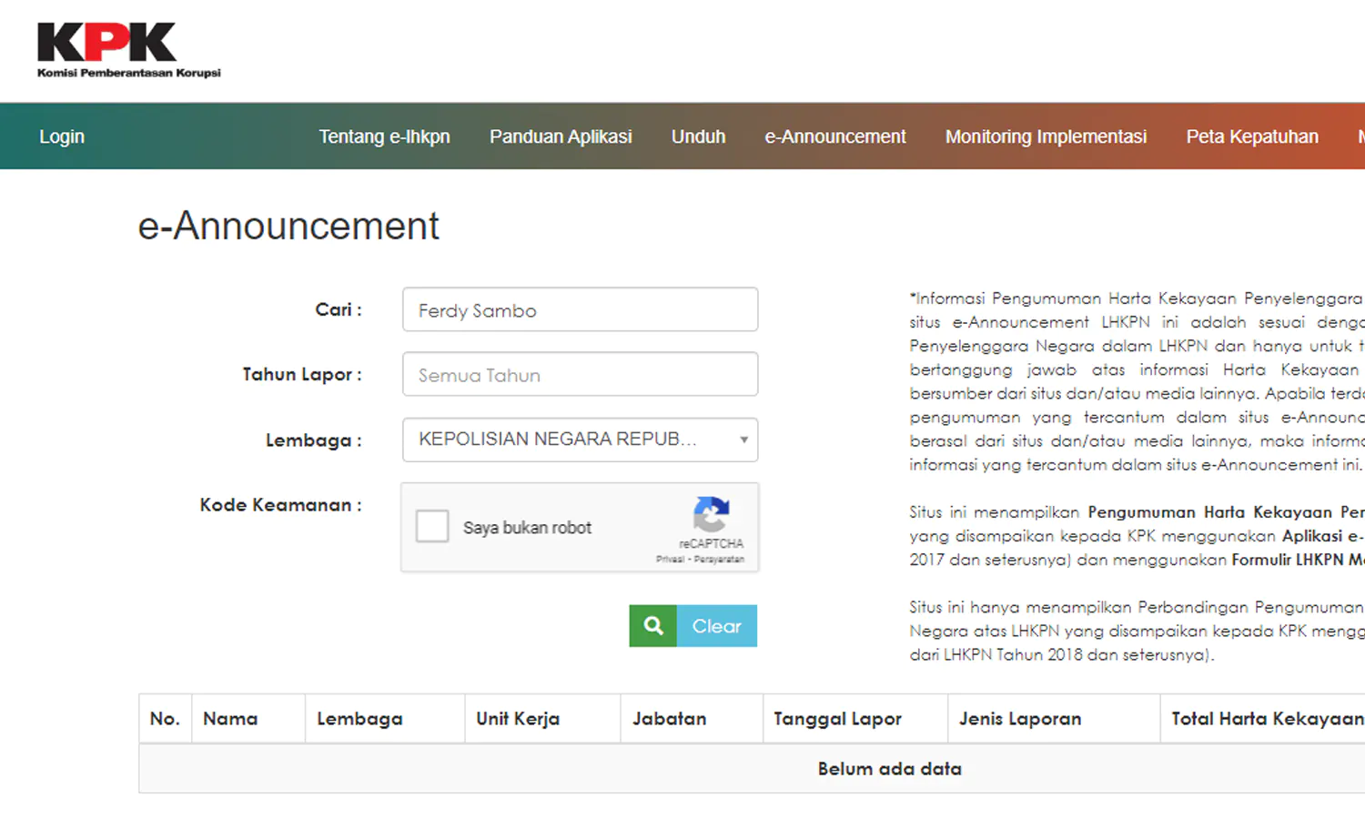 Namun saat Parboaboa mencoba mengakses pengumuman LHKPN Ferdy Sambo di situs elhkpn.kpk.go.id, hasilnya nihil. Dengan kata lain, dari menjabat sampai dipecat, jumlah harta kekayaan Ferdy Sambo masih menjadi misteri.