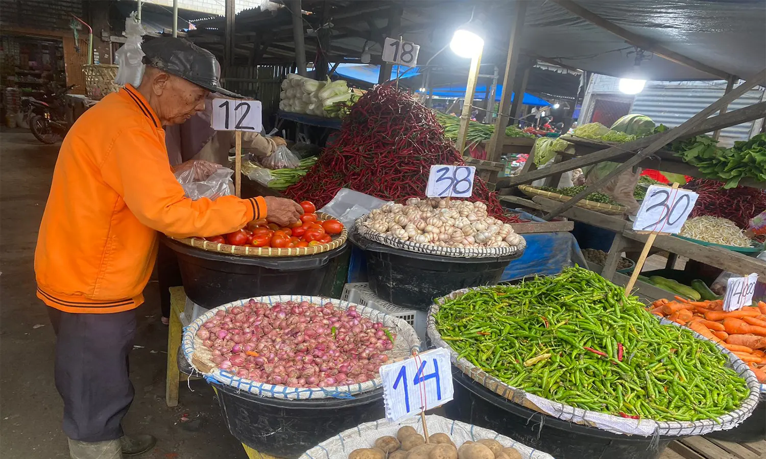Tomat saat ini berada di kisaran harga enam sampai tujuh ribu rupiah per kilogram, kacang panjang di kisaran sepuluh ribu rupiah per kilogram.
