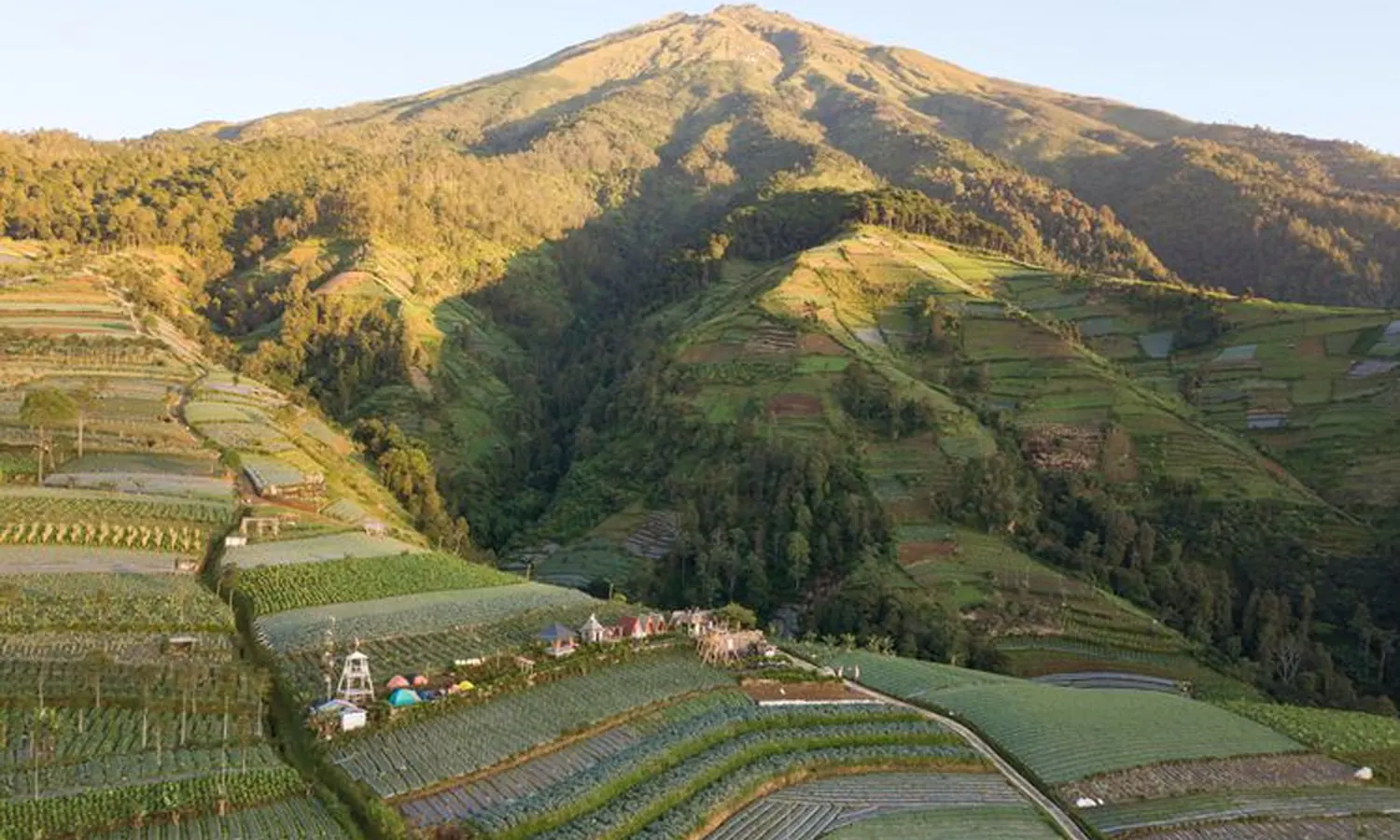 Bentang alam perbukitan yang tampak hijau berhiaskan perbukan sayuran. Terlihat unik dengan kontur terasering.