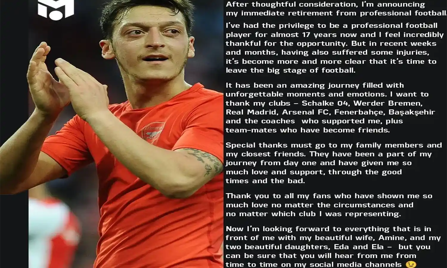 "Ini adalah perjalanan yang luar biasa, dipenuhi dengan momen dan emosi yang tak terlupakan. Saya ingin berterima kasih kepada klub-klub yang saya bela, yaitu Schalke, Werder Bremen, Real Madrid, Arsenal, Fenerbahce, dan Basaksehir, serta kepada para pelatih dan rekan satu tim yang telah mendukung saya selama karier saya," ujar Ozil.