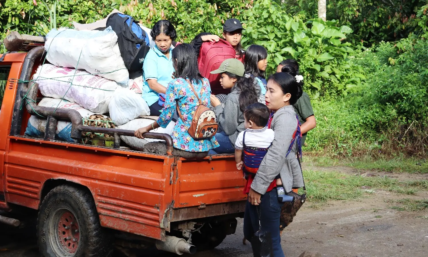 Berdesak-desakan di bak mobil sudah menjadi hal yang biasa bagi mereka yang ingin pergi ke kota.