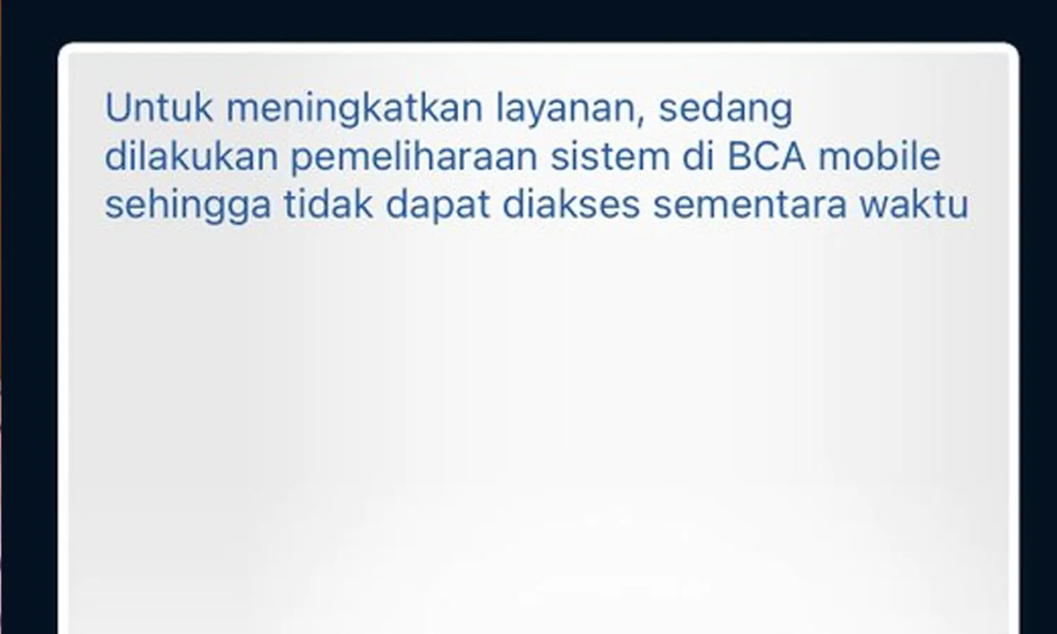 PARBOABOA, Pematangsiantar - Nasabah pengguna layanan transaki online di aplikasi mobile banking BCA malam ini harus bersabar, pasalnya aplikasi milik bank swasta terbesar di Indonesia tersebut sedang error.