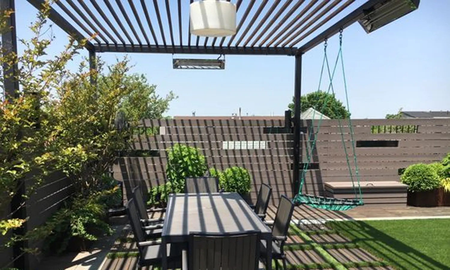 Perabotan berupa dek kayu besar bisa jadi pilihan utama ketika merancang atap rooftop dengan penambahan pergola supaya tetap teduh.